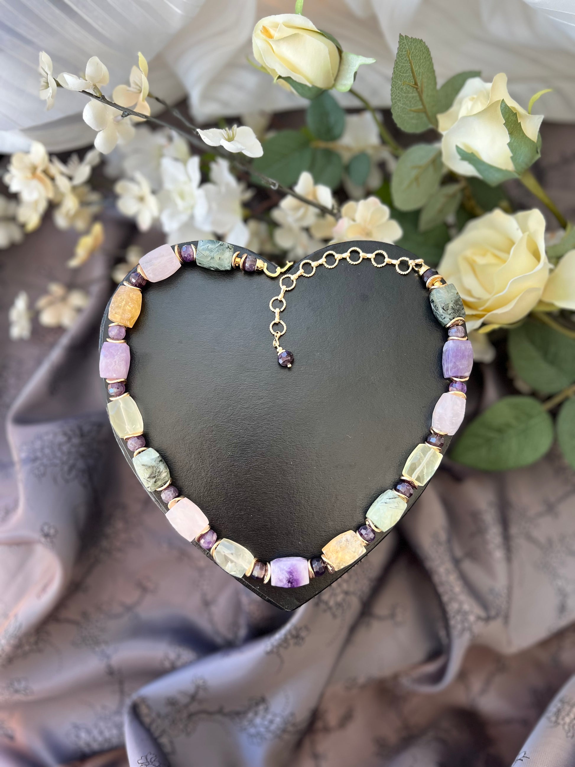 Step into a Garden of Light with this radiant necklace, handcrafted from natural faceted gemstones: